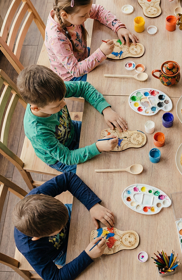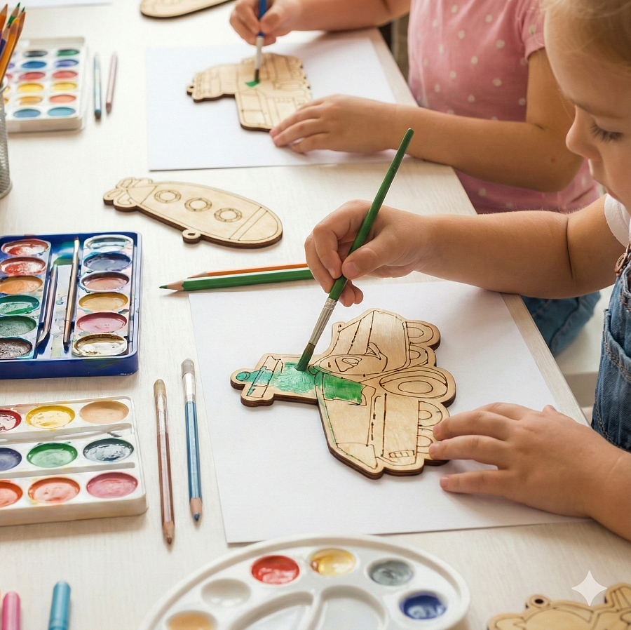 Работа с деревянной заготовкой, развитие мелкой моторики, чувства цвета и композиции.