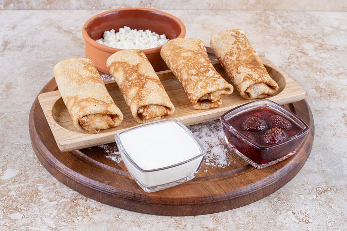 - Блинчики с творогом, сметаной и вареньем.